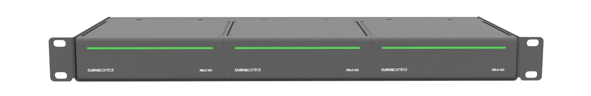 Insert up to three Cueva Control units into the RM99 bays. The bracket accepts RELO IO8, LUMO U1, and LUMO U2A.